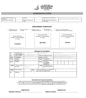 • Prospectus and Registration form can be obtained from the school office or online from www.jaipuriaschoolbasti.in by paying the registration fee and completed Registration form need to be deposited in the School office within a specific